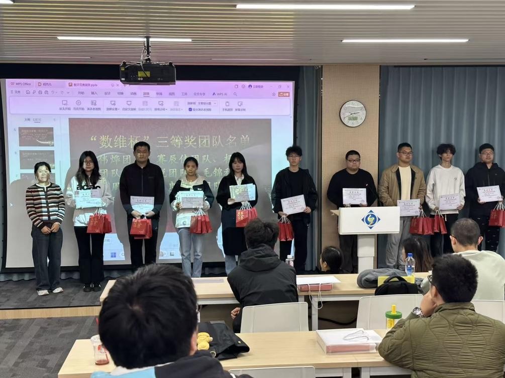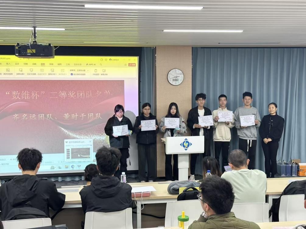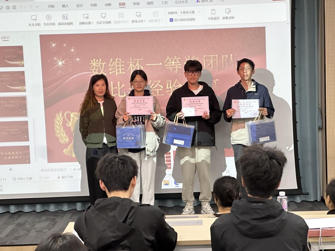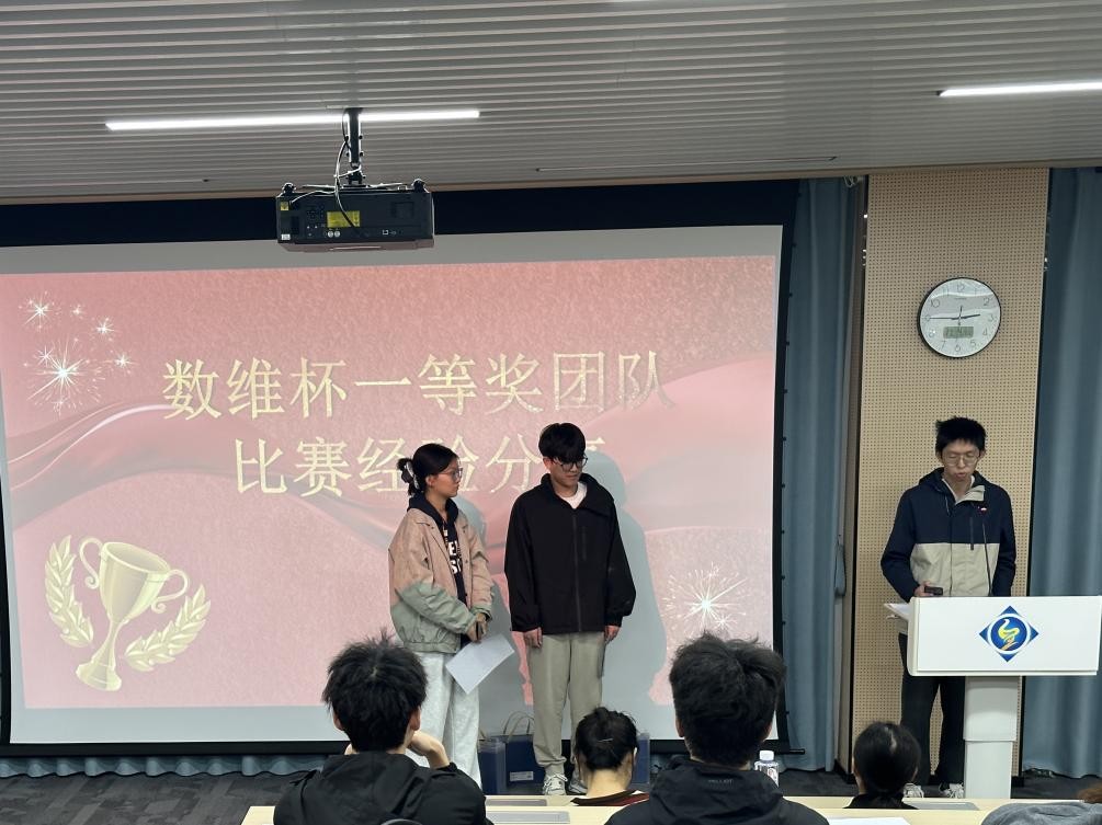 学生处副处长杨芬菲与数维杯一等奖团队成员合影 经验分享:创新背后是协作与坚持 “沉甸甸的证书,是 3 个人72 小时连轴转、反复打磨模型的结果。”在获奖分享环节,获得“数维杯”一等奖暨全国创新奖团队成员杨景灏、陈智恒、王子聪同学上台分享了竞赛背后的故事。杨景灏提到,面对复杂建模题目,团队从“分工调研”到“交叉验证”,再到“推翻重来”,每一步都离不开刘文斌老师的专业指导,更离不开 3 人间的默契协作——“有人擅长数据处理,有人专注逻辑推导,有人负责文书撰写,互补才能高效突破”。团队还分享了实用备赛经验:赛前积累大量建模案例、熟悉常用软件;赛中合理分配时间、避免陷入“细节陷阱”;赛后复盘总结、梳理不足。干货满满的分享,让在场有意向参与竞赛的同学深受启发。