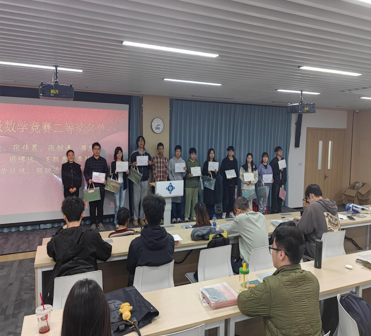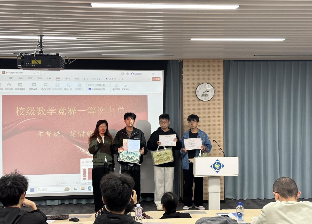 学生处副处长杨芬菲为颁奖典礼致辞 颁奖时刻:双赛闪耀 见证硬核实力 颁奖仪式作为典礼核心环节,分两大竞赛依次展开,现场掌声雷动,见证学子们的努力与荣光。 在第二届大学生数学竞赛表彰中,经层层比拼与严格评审,17 名同学斩获三等奖(刘昊斌、黄立衡等),12 名同学荣获二等奖(林志佳、张佳晨等),张潇予、齐贤梁、梁浦维、黎成4 名同学凭借扎实功底摘得一等奖。数理教研室专业主任王娜、基础部副主任常月华、校学生处副处长杨芬菲分别为各奖项获奖同学颁奖。所有获奖同学将作为学校“2025 年第十七届全国大学生数学竞赛初赛”种子选手,备战 11 月 8 日的上海市级初赛。学校基础部数理教研室已组建专属辅导团队,通过线上刷题打卡、线下专项培训双向发力,助力学子备赛。