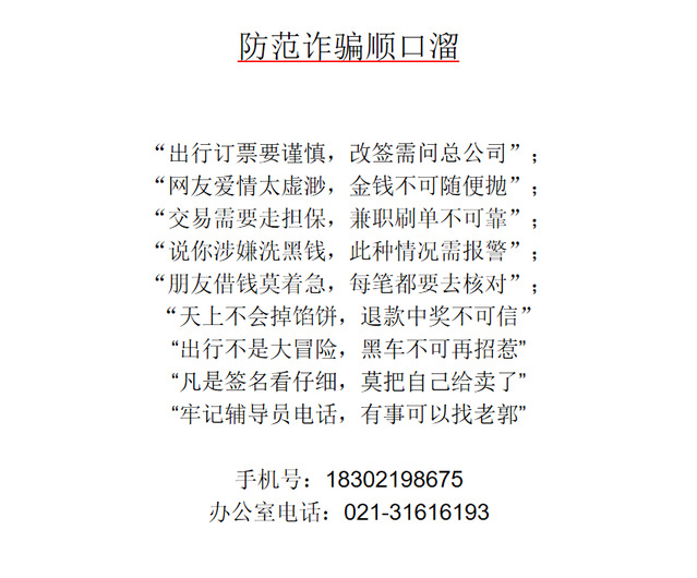 在本次主题班会接近尾声的时候,辅导员与大家分享了自己原创的防诈骗顺口溜,“出行订票要谨慎,改签需问总公司”;“网友爱情太虚渺,金钱不可随便抛”;“交易需要走担保,兼职刷单不可靠”;“朋友借钱莫着急,每笔都要去核对”;“出行不是大冒险,黑车不可再招惹”“凡是签名看仔细,莫把自己给卖了”“牢记辅导员电话,有事可以找老郭”。并向宿舍长发放了张堰镇派出所印刷的防诈骗小卡片。