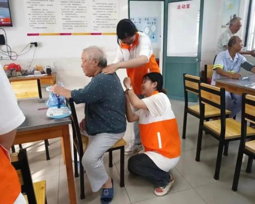 志愿活动井然有序地进行着,拿出仪器,分发慰问品,捶腰按摩,志愿者们以专业的素养和热情的态度为老人提供各类服务,老人在整个活动中也感受到了浓浓的爱意和幸福感。