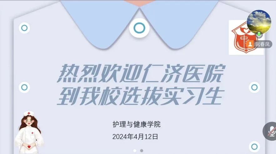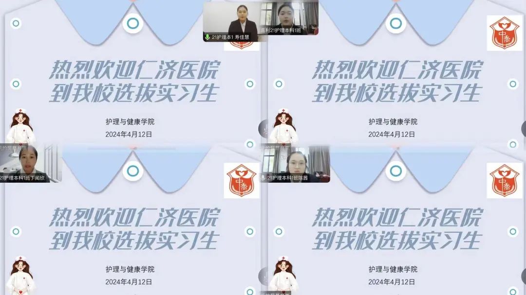 2024年4月12日上午,为促进我院学生高质量实习就业,落实院企合作,护理与健康学院开展上海交通大学医学院附属仁济医院线上实习面试,面试由仁济医院护理部阮春凤老师负责,共有35名学生参加。