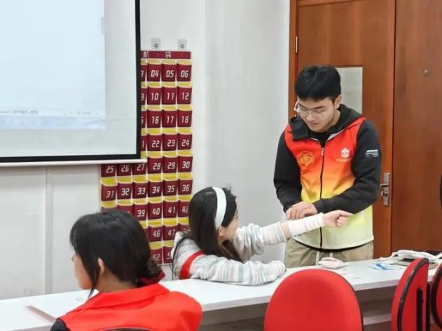 在培训最后,同学们自行成组互相练习这节课学习的要点,深入浅出的教学模式调动了同学们的学习积极性,面对同学们的疑问,急救队队员袁雪颖耐心的一一解答。