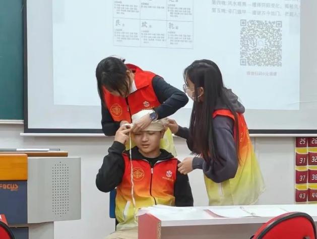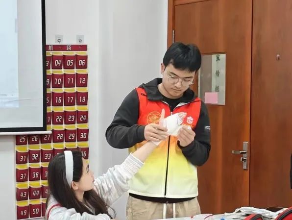 随后,急救队队员张继中讲解了毛巾包扎、绷带包扎、三角巾包扎、创可贴包扎几个重要的包扎方法。其中重点强调了使用绷带的环形包扎法和螺旋形包扎法。