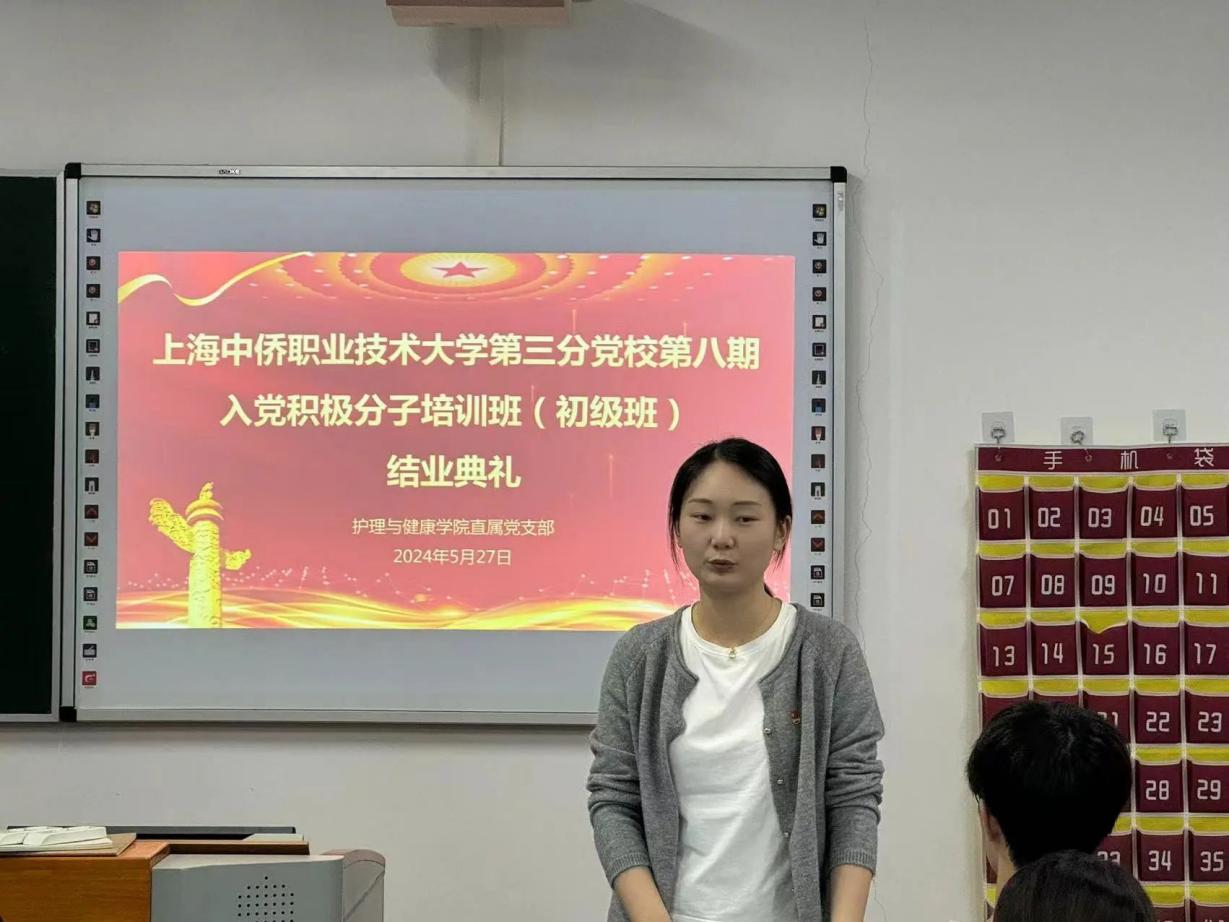 为全面考察初党学员的政治素质和党性修养。护理与健康学院于52718:307号楼501教室开展初党培训结业仪式,全体初党学员参与本次结业仪式。出席本次结业仪式的老师有护理与健康学院直属党支部副书记郭帆、护理与健康学院直属党支部宣传委员张玲、护理与健康学院直属党支部纪检委员汤雅琪、护理与健康学院直属党支部组织委员陶丽。本次结业仪式由护理与健康学院直属党支部组织委员陶丽老师主持。