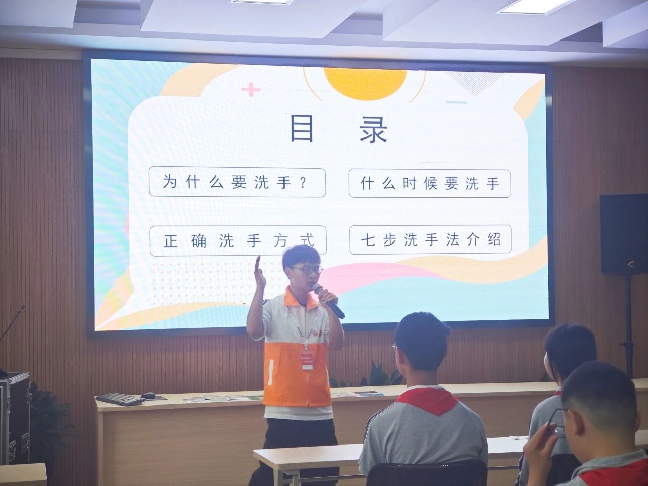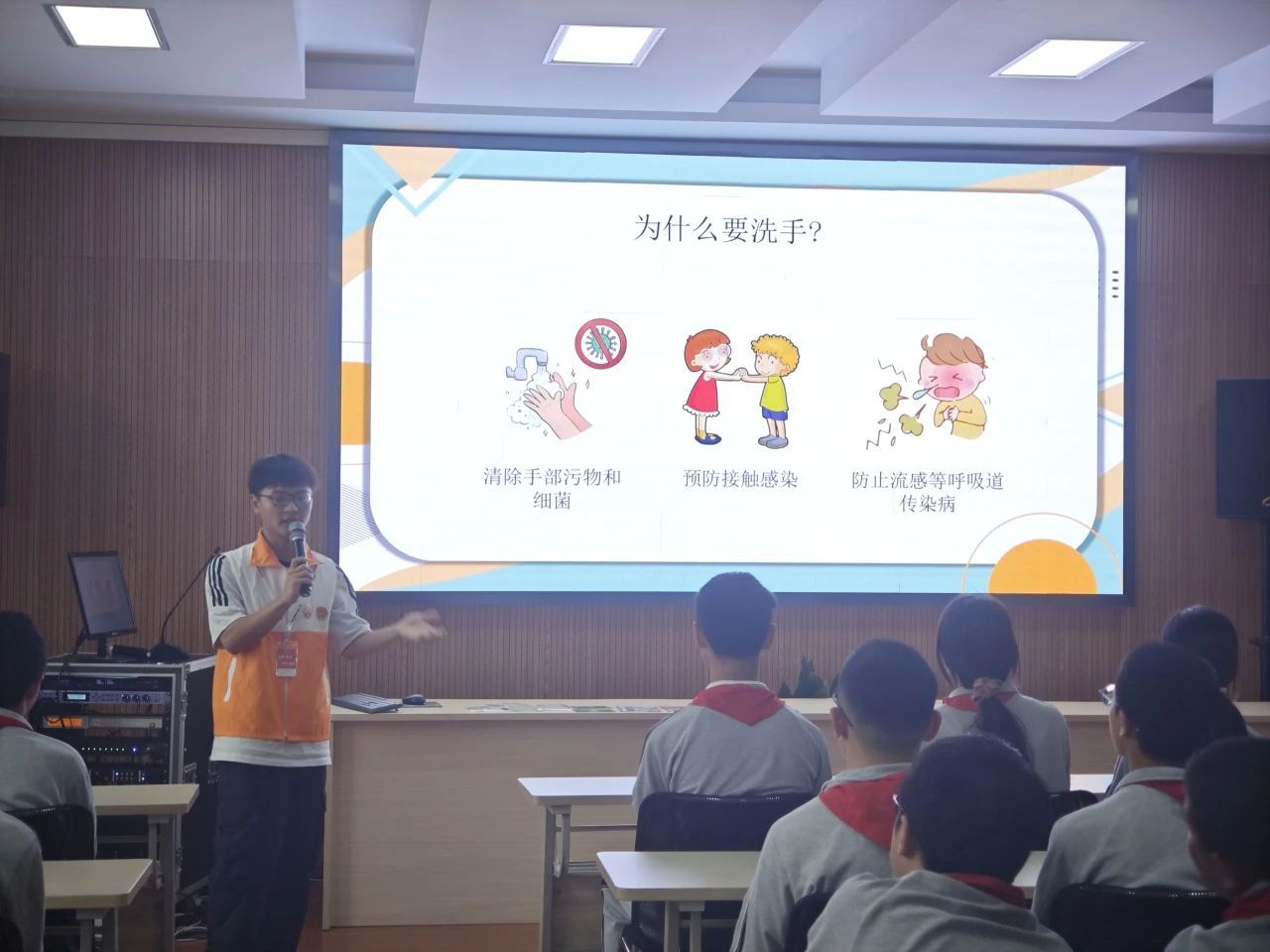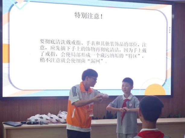 最后,志愿者们为同学们表演了洗手操,以节目的形式展示了洗手的正确步骤,并鼓励同学们跟随志愿者的动作一起摆动双手。