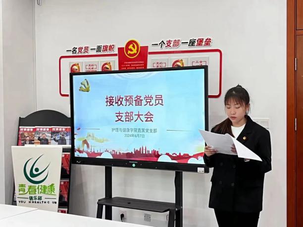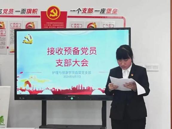 为进一步做好党员发展工作,为党支部注入新鲜血液,2024年6月7日,护理与健康学院直属党支部召开关于姚凤怡、陈志菲两名同志的预备党员接收大会。会议由我院直属党支部组织委员陶丽老师主持。