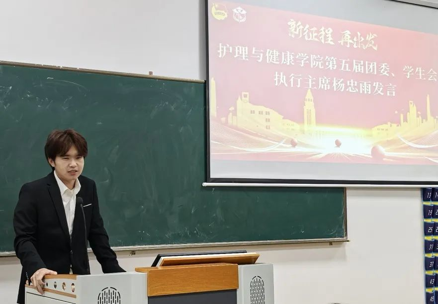 大会第一项议程,我院团委、学生会执行主席杨忠雨上台发言。他表示,护理与健康学院第五届团委、学生会全体成员应当不断提高自身素养,为同学们树立一个良好的榜样。同时,希望所有新干事在各类活动中团结协作,不畏困难,共同进步。