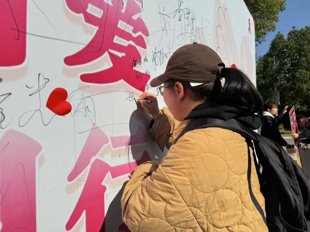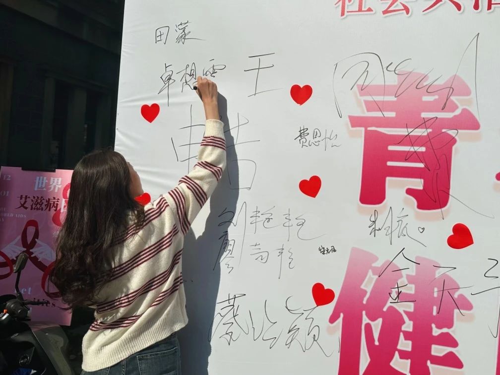 活动期间,志愿者们积极开展了一系列艾滋病防治宣传活动,他们向同学们发放了艾滋病宣传册以及宣传折页,精心制作了展板并邀请同学们在上面进行防艾签名。