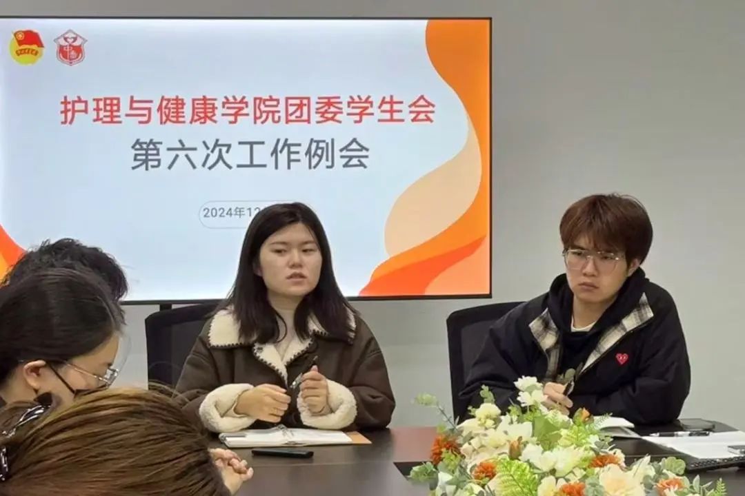 为加强团委、学生会各部门间的交流与合作,明确后续的工作方向,护理与健康学院团委、学生会于2024年12月12日18:30在7-209教室召开第六次工作例会。本次会议由我院团委副书记、学生会执行主席杨忠雨主持,团委书记张玲老师、主席团成员及各部门干部参与。