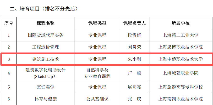 近日,上海市高职高专课程思政与文化素养教指委公布2025年度上海市高职高专优秀课程建设(原课程思政示范课程项目)名单,上海中侨职业技术大学建筑工程学院朱小利教授负责的《建筑施工技术》课程成功入选培育项目。