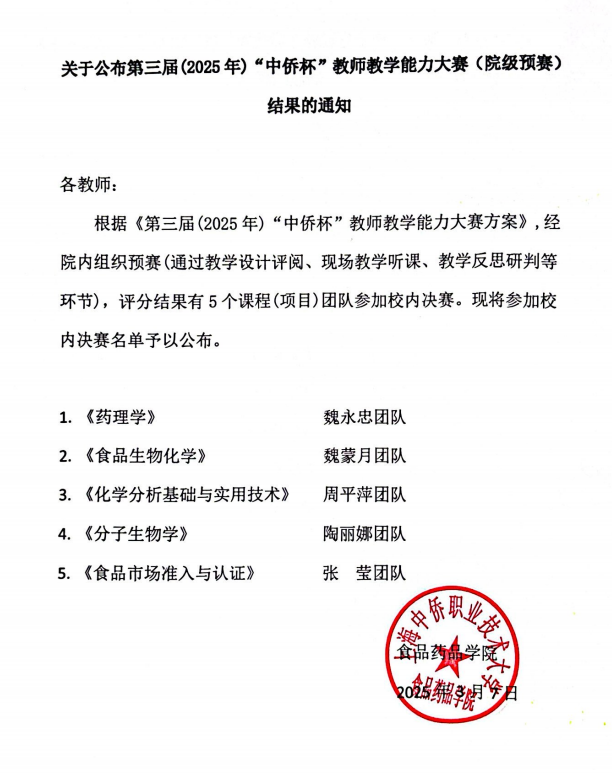 On March 7, 2025, the School of Food and Pharmacy held the preliminary round of the 3rd Zhongqiao Cup Teacher Teaching Skills Competition in Building 6 # 317. The meeting invited Zhu Weiwen, Director of the School Teacher Development Center, Dai Xiaobo, Commissioner of the School Academic Affairs Office, Wang Yuan, Vice Dean of the School of Food and Drug, Chen Jianlan, Deputy Secretary of the Party Branch of the School of Food and Drug, and Yang Jing, a senior teacher of the School of Food and Drug, to serve as judges for the competition. The college teachers observed the competition, which was hosted by Wang Yuan, Vice Dean of Teaching.