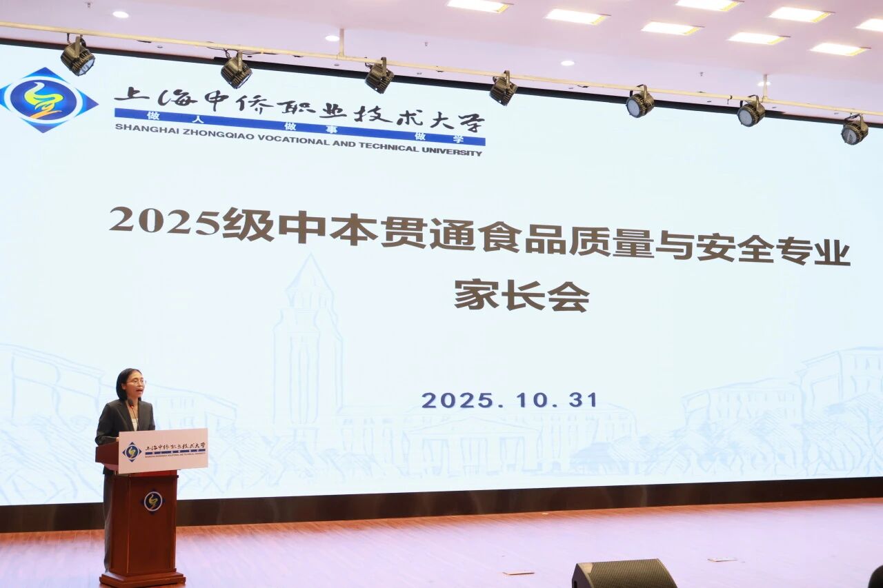 To help students clarify their undergraduate training path and strengthen the transition foundation of the Middle-to-Higher Vocational Integrated education model, the School of Food and Pharmacy successfully held a parent meeting for the 2025 cohort of the Food Quality and Safety program on October 31, 2025, at 9:00 AM on the second floor of the Library and Information Building. The meeting was hosted by Mrs. Ouyi Ming, Director of the Food Quality and Safety program, and attended by Vice Deans Ji Jing and Wang Yuan of the School of Food and Pharmacy.